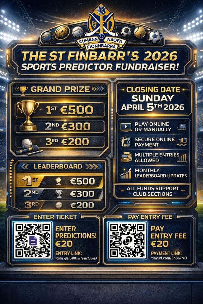 We are delighted to launch the very first St Finbarr’s Sports Predictor Fundraiser for 2026 — an exciting new competition designed to bring supporters together while raising vital funds for our club.